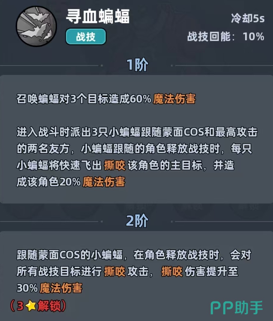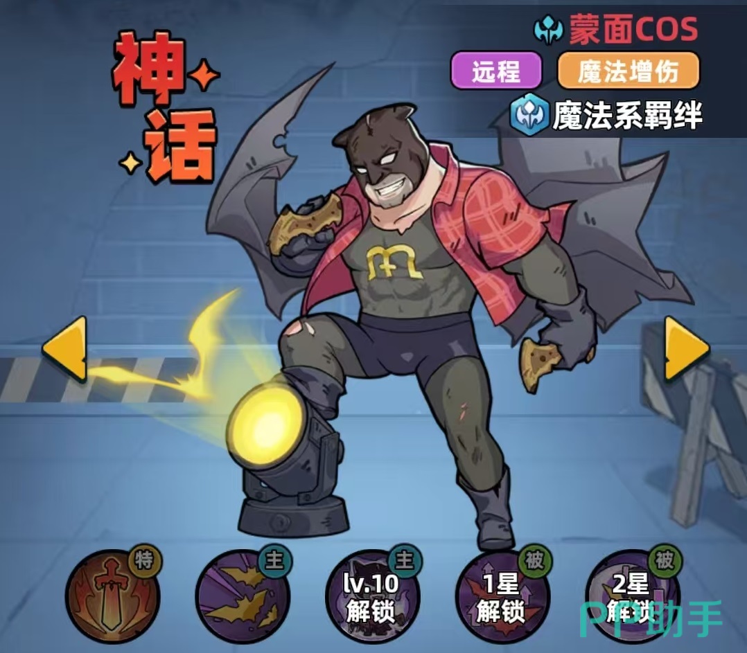 蒙面COS为神话品质远程法师,绑定魔法系羁绊。基础特性明确:所有伤害类型均享受25%全局增伤,额外提升10%魔法伤害。主动技能“寻血蝙蝠”可对至多三名敌方单位施加魔法伤害;进入战斗时,自动部署三只小蝙蝠,分别跟随自身及场上攻击力最高的两名友方单位;当被跟随者释放战技时,对应蝙蝠立即发动撕咬,同步造成魔法伤害,形成高频协同输出链。