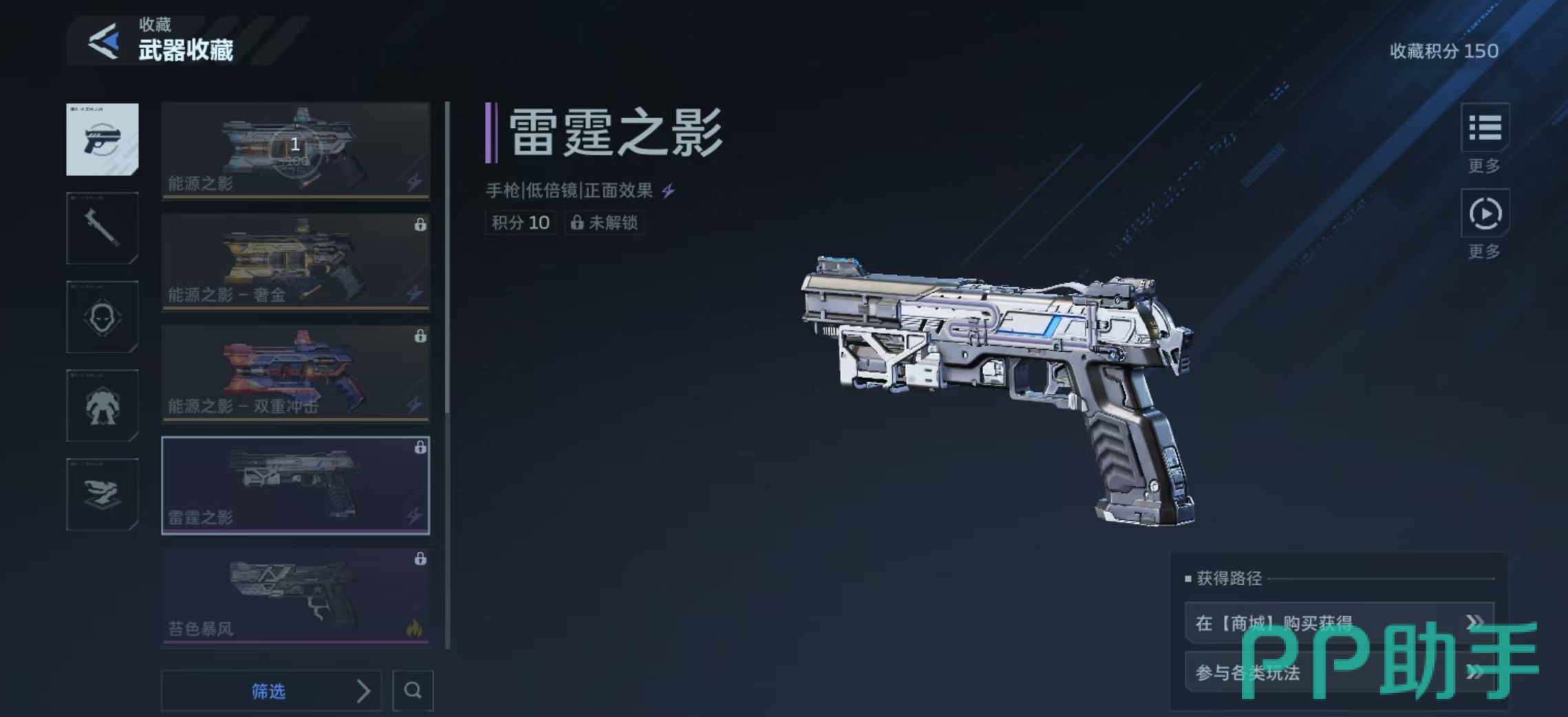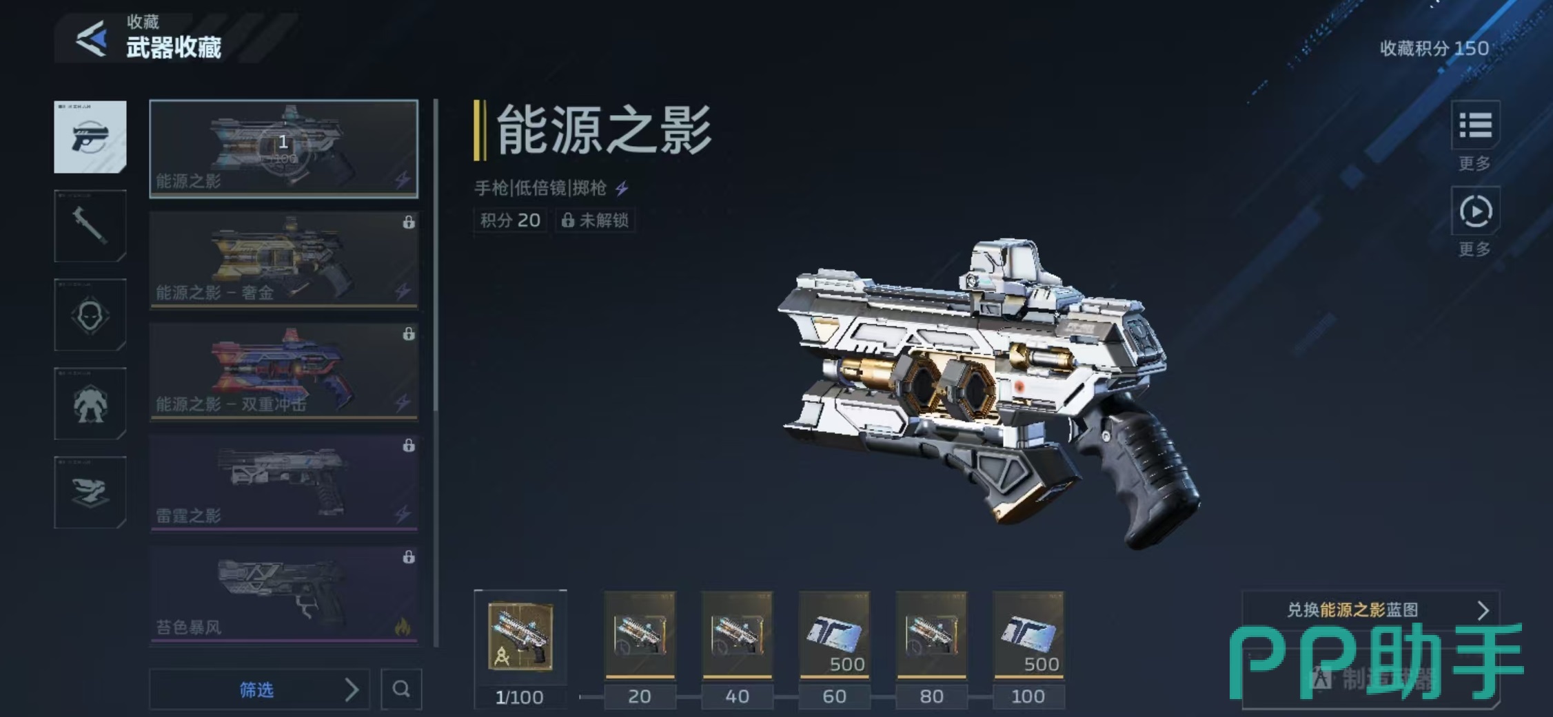 目前游戏中已实装的手枪共四款:能源之影、雷霆之影、苔色风暴、乘风快递。其中,能源之影为传说品质手枪,拥有奢金与双重冲击两款外观皮肤,所有皮肤均不改变基础属性与技能逻辑,纯属视觉定制。综合强度、机制自由度与战场泛用性,能源之影被广泛视为当前版本首选副武器。