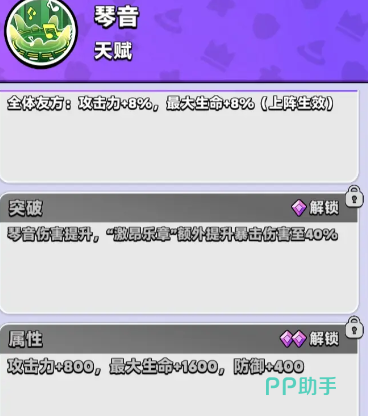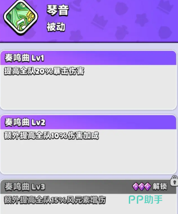 作为风属性专属辅助,琴音在当前版本中定位为T0级团队增益型角色。满培养状态下共解锁8项技能,其中7项为全体生效的光环类效果,1项为功能性辅助技能,覆盖输出强化、生存续航与机制适配等多个维度。