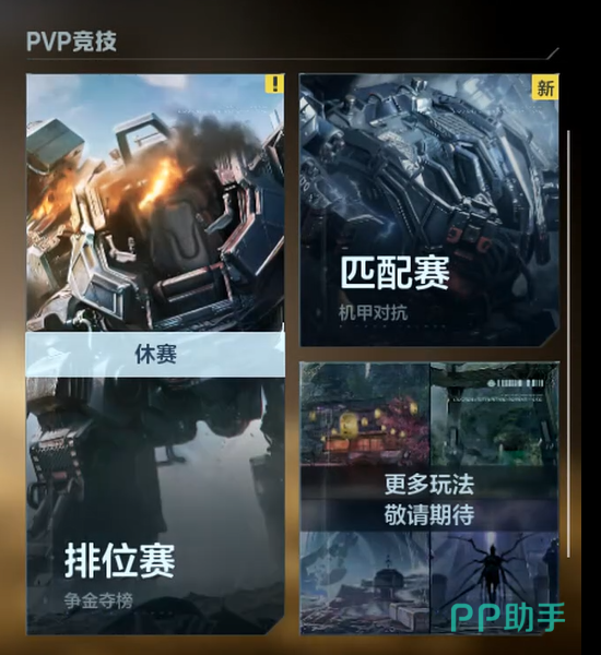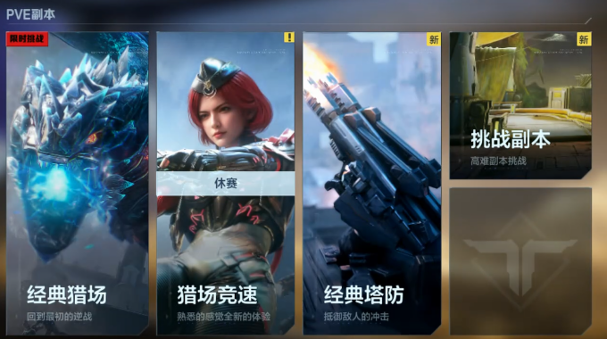 游戏整体划分为PVE(玩家对抗环境)与PVP(玩家对抗玩家)两大方向。其中PVE包含五种模式:经典猎场、经典塔防、挑战副本、经典猎场竞速、时空追猎;PVP则涵盖匹配赛与排位赛两类对战形式。七种模式在目标设定、协作逻辑与策略维度上各具特色,不存在功能重叠。