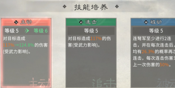 连弩军的核心竞争力全部都会隐藏在被动技能里面,和英雄的华丽大招并不完全相同。连弩军的主要优势就在于越打越猛,在完成两次连击之后,每一次都会触发额外连击,虽然说后续伤害会衰减到上一次的50%,但是就可以触发多次连击。想要发挥这一份潜力,建议优先把连弩军的技能直接拉到5级以上,满级主动技能就可以直接造成124.8%的伤害。输出稳定性还是比较有优势性的。在培养方面,属性提升优先点根基固实,可以额外的增加攻击防御,还有生命,让连弩军又能打又能扛。