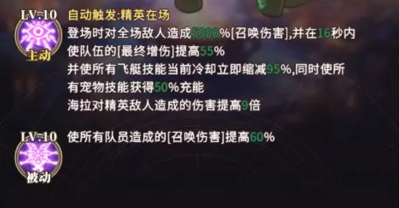 海拉的主动技能会在有精英野怪出现的时候自动触发的,当海拉登场以后会适用召唤技能直接对全场的敌人造成5000%的召唤伤害,还能够在16秒的时间内让队伍的最终增伤提升55%,此外,海拉在场的时候还可以让所有的飞艇技能冷却的时间算短95%,注意这个缩短效果是立即的,同时所有的宠物技能还将会获得额外50%的充能,海拉对于精英敌人所造成的伤害在原本的基础上直接提高9倍,这也让海拉成为精英敌人的克星。