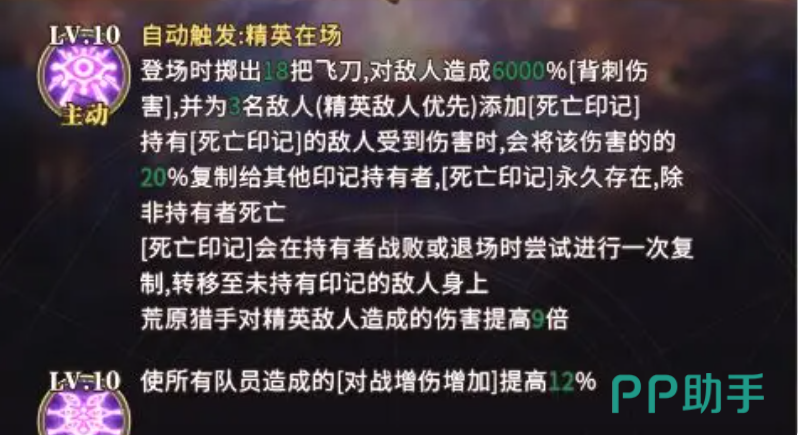 荒原猎手的被动技能为团队增益型效果,在战斗开始时即生效:当其处于编队中时,我方全体成员对精英单位造成的伤害提升12%。结合其主动技能的连锁伤害与印记转移机制,该角色在应对Boss战、多精英副本及高难度挑战场景中展现出极强的战略价值,尤其擅长快速瓦解精英集群并放大整体输出效率。