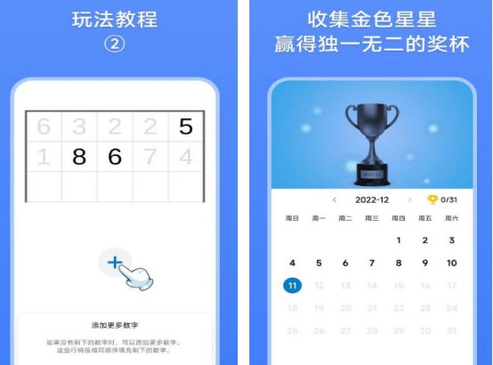 与常见的各种数字通过相加等于10,或者是两个完全一样的数字进行组合的方式,就能完成消除的任务。有特别简约的设计风格,只需要利用移动手指的方式,就可以在斜方向或者是垂直水平的各种方向当中,完成相应的任务,获得更高的分数。不仅需要在玩的过程当中开动脑筋,还有玩法教程,可以帮助大家轻松的完成任务。