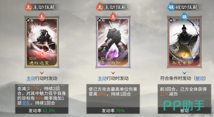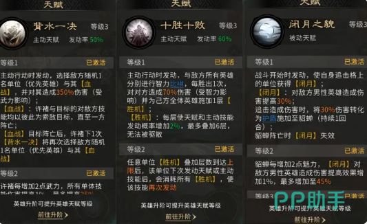 貂蝉承担体系中的功能性补强角色。“闭月之貌”天赋使其在面对敌方英雄时造成额外伤害;若其魅力属性高于场上全部敌方单位,则在触发追击时,有概率额外多出两次追击效果,大幅提升节奏压制力。技能配置上,主动技优先选用“鼎力相助”(降低敌方攻击力)与“通权达变”(提升我方伤害),二者形成攻防一体的增益组合;被动技能可搭配“兵无常势”以强化前三回合的群体减伤效果,显著提升阵容前期容错率。同样需注意:貂蝉须达彩色品质方可启用双主动技能槽,未达标时仅能二选一装配。