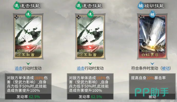 许褚的核心输出依赖天赋“背水一绝”,开启后强制与一名敌方单位进入血战状态,双方技能将唯一锁定彼此,规避误伤与目标丢失风险,是实现关键英雄定点清除的核心保障。其被动“白虹贯日”固定提升20%暴击率,配合暴击率类宝物,可显著提升暴击触发稳定性。需注意:仅当许褚品质达到彩色时,方可解锁双追击技能槽;未达彩色品质时,主动技能栏位仅能装配“万军取首”一项。