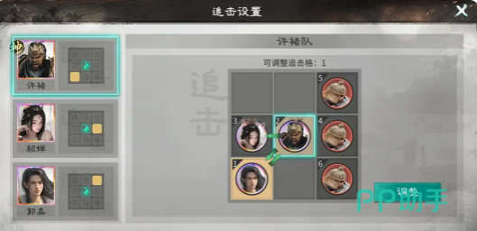 布阵逻辑强调前排承伤与后排联动的双重保障:首列配置三名藤甲兵,利用其高物理减伤特性构筑坚实屏障,有效隔绝敌方前排冲击,为后排许褚创造稳定输出窗口。站位设计遵循追击格触发规则——许褚必须置于郭嘉与貂蝉的追击范围内,同时郭嘉自身也需位于许褚的追击格中,由此激活连续追击响应机制;貂蝉站位相对灵活,主要服务于技能覆盖与属性压制,无需严格限定于特定追击格。