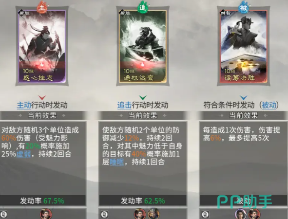 技能组合强调控制与伤害的深度协同。袁绍主动技“惑心挫志”兼具群体伤害与虚弱效果,有效限制敌方输出节奏;追击技选用“通权达变”,附带降低防御与睡眠控制,打乱敌方阵型衔接;被动技“运筹决胜”为其量身定制——每次造成伤害均可提升6%自身伤害,配合其高频发动的天赋,5层增益可在短时间内叠满,实现伤害指数级跃升。该机制与控制链形成良性循环,最终借助兵力优势达成高效收割。