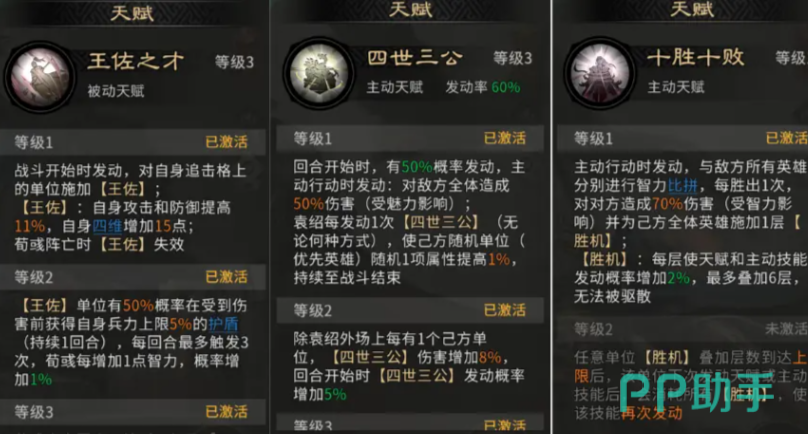 天赋系统是本阵容的核心驱动力。袁绍的“四世三公”天赋拥有60%发动率,可在每回合开始时施放全体伤害,并为己方随机单位叠加属性增益,全程累积后属性提升显著;荀彧的“王佐之才”提供双维强化——直接提升袁绍11%攻击与防御,同时为受加持单位增加15点四维属性,并赋予其概率获得兵力护盾的能力;每1点智力额外提升护盾触发概率,进一步增强容错空间;郭嘉的“十胜十败”则聚焦智力博弈,获胜后触发群体伤害并叠加“胜机”状态,实现战术层面的二次压制。