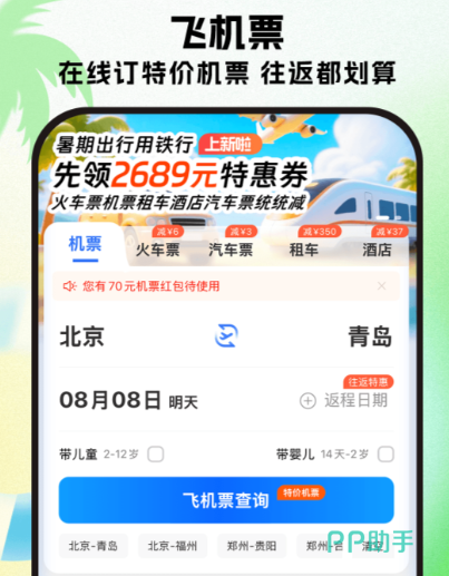 专注低价票源挖掘,该应用聚焦于非标航班资源运营,包括航空公司尾单、限时促销、系统错价(BUG票)及合作旅行社特供库存。界面设计强调时效性与紧迫感,突出“抢购”交互逻辑;推送机制优先触达高折扣信息,适用于对价格高度敏感、出行时间灵活的用户群体。