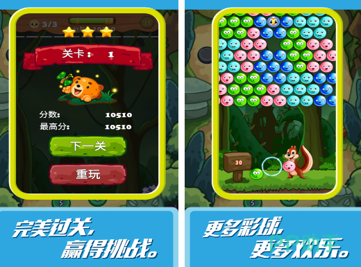 本作延续传统三消逻辑,同时融入特色射击机制:玩家需操控小松鼠角色,瞄准并发射同色球体,实现精准匹配消除。关卡目标明确,均设定具体分数门槛,达成即通关。丛林主题场景搭配圆润Q版画风,配合流畅的描线反馈与轻快音效,营造出兼具策略性与休闲感的闯关体验。