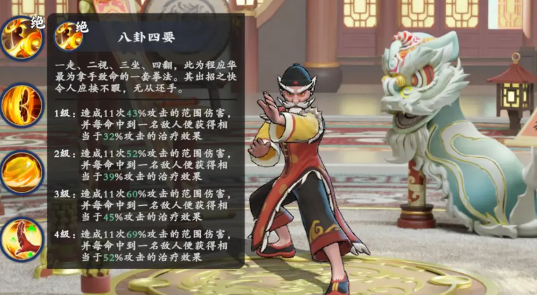最后为大家推荐的就是程应华,程应华当前在使用的掌法效果上面技能效果会更多一些,而且他的绝招效果上面连续带来的是十一次连击,是可以根据范围类型带来43%的单次伤害的,那么这个百分比的伤害叠加起来之后造成的整体数值也是非常高的,在这里命中的敌人之后他还会给自己带来32%的治疗效果,这个治疗效果根据实战里面大家遇到的敌人来看,程应华更适合放在中排的位置,这样的话吸引到敌人火力之后,他的回血也可以根据敌人的数量来进行计算,攻击到敌人数量越多的时候,程应华带来的回血百分比就越高,所以在这里程应华的站场能力到后期反而是会更强一些的。