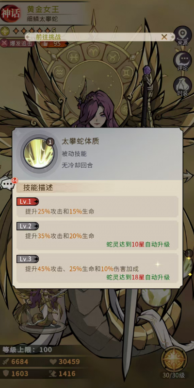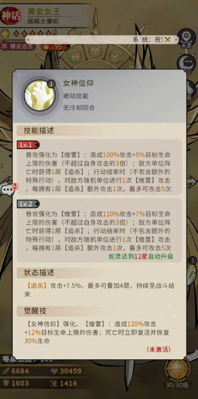 太攀蛇体质属于黄金女王固定的被动增益,为她提升25%攻击和15%生命,10星的时候技能自动升级到二技,此时可以提升35%攻击和20%生命,18星的时候就有45%攻击、25%生命和10%伤害加成。最后的女神信仰虽然同样也是被动,但是技能效果比基础增益要强,这里会让黄金女王的普攻强化为【煌雷】,然后造成100%攻击+5%目标生命上限的伤害,这个数值不会超过黄金女王攻击的3倍,而且在敌方单位阵亡爱可以获得1层【追杀】,一直到行动结束之后就会对敌方随机目标进行1次【煌雷】攻击,每拥有1层【追杀】的时候可以额外攻击1次,最多的时候可以攻击到5次,12星的时候这个普攻会强化为造成110%攻击+7%目标生命上限的伤害,让敌方的这个目标阵亡,黄金女王还可以获得1层【追杀】的效果,她每拥有1层【追杀】就会有额外攻击1次的能力,最多是可以看增加攻击5次的。
