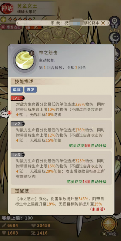 第一个技能就是神之怒击,主动用起来就是针对单体敌人,进行爆发的时候可以带来更多的团队加成,如果是对敌方生命百分比最低的目标进行输出的话,这里可以造成228%的物伤,而且同时在上面还可以附带目标足够生命上限10%的物伤,但是这里的物理伤害是不能超过自身攻击的4倍数值的,其中还可以无视敌人身上10%的防御数值,而在蛇灵升级到6星之后的能力就变成了对敌方生命百分比最低的一位目标造成276%的物理伤害,此时大家也可以附带目标生命上限12%的物伤进行输出,但是在无视的时候会让我方角色得到15%的防御无视效果,最高到14星的时候升级为对敌方生命百分比最低的角色造成325%物伤,同时附带目标生命上限15%的物伤,此时的无视数值变成了20%防御,而且在攻击之后去其实来驱散目标身上增益状态效果上面还是非常有优势的,而在觉醒之后的神之怒击技能强化之后,大家可以看到的伤害数值也会提升到346%的数值,此时也可以附带目标生命上限提升到18%的数值,无视目标防御的数值提升到25%的数值。