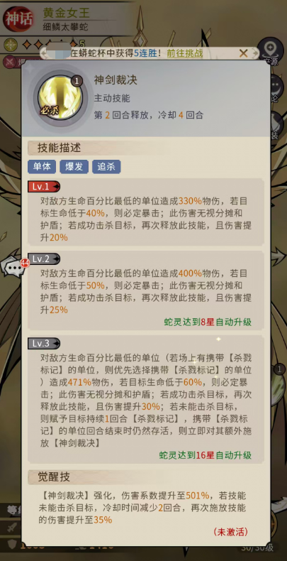 第二个技能就是神剑裁决,作为黄金女王的必杀技,可以给单体的敌人带来暴发输出之后,还有一个追杀的机制,此时黄金女王可以对敌方生命百分比最低的单位造成330%物伤,若目标生命低于40%,那么这一次的输出是必定产生暴击的,而且这里的暴击伤害无视分摊和护盾的防护,如果这一次的暴击成功击杀目标,黄金女王则是可以再次释放此技能,且伤害提升20%,所以算是一个非常有用的追击技能。