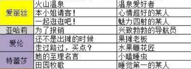 【爱丽丝】——“火山温泉”,身份为“温泉爱好者”,“本小姐请客”,身份为“心情超好的某人”,“一起逛逛吧”,身份为“魅力四射的某人”;【亚哈莉】——“为了报销”,身份为“兴致勃勃的导航员”;【爱伦】——“还不是出摊的时候”,身份为“果摊老板”,“走过路过,买点”,身份为“水果雕花酱”;【特蕾莎】——“他的至理名言”,身份为“小瞌睡虫”,“田园牧歌”,身份为“睡觉第一的某人”;【玛洛莉】——“怦然心动”,身份为“艺术的烟花”;【菲妮丝】——“秘密观察”,身份为“女神大人的信徒”;【格丽特儿】——“冒险者采访”,身份为“镜中采访者”。