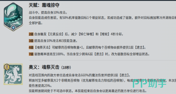 天赋【霜魂掠夺】是其战术压制链的中枢。战斗中恒定提供10%攻击力加成;技能命中时有50%概率驱散目标一项增益效果,成功驱散后附加寒冷状态,并清除目标当前所有护盾。当天赋升至7级时,驱散概率提升至100%;若在战斗中累计触发6次“遗言”效果(每次技能命中或驱散均可叠加),即可一次性移除目标全部增益状态。该特性使其在对抗多层Buff堆叠型敌人时具备显著克制优势。此外,角色在触发元素反应(如超导、冻结、感电等)后,可缩减核心技能冷却时间,大幅增强其在元素协同阵容中的适配性与循环效率。好感度满级后可解锁专属剧情动画,成为收集向玩家的重点培养对象。