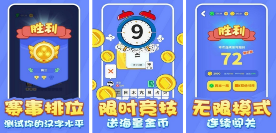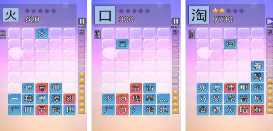 消除以及汉字合成的元素相互碰撞,每个关卡开始之后都会从屏幕最上方掉落下不同的格子,而格子中又会呈现出不同部首或者是汉字,在这些方块掉落之前,需合理滑动,并且精准放置,将部首或者是汉字放在一起,就能合成全新的汉字,只要符合要求就可以达到消除的效果,每次在消除之后都可以获得相应的分数,如果能做到整行或整列消除的话,分数一定会快速增加。