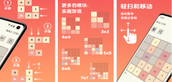 屏幕中可能起初会有简单的几个数字方块,通过正确滑动的方式,就能让两个数值相互碰撞并快速翻倍,就比如4和4相互碰撞时就会变成8.每个关卡中都有具体的目标,会在方块的上方看到下一个目标,比如合成1024方块或者是合成2048方块。在合成的过程中也要仔细了解其中的提示,尽可能将最大的数值放在角落上,这样才不会影响自己的得分。