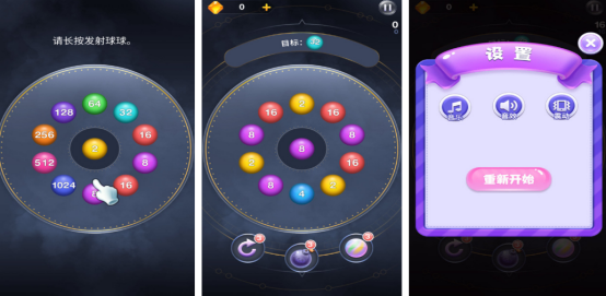 发射弹珠就能合成更高的数值,整体采用卡通的画风所展现,在屏幕正中央会看到一颗带有数字的球球,比如2或者是八等等,在球球的外圈也会有多种不同的数字来回旋转,通过精准瞄准的方式就能成功发射球球,还要将两个相同数值的球球,放在一起即可获得更高分数,其中还有具体的目标,比如合成32或者合成64等等嗯,在最下方又会呈现出三个辅助的道具,让大家顺利通关。