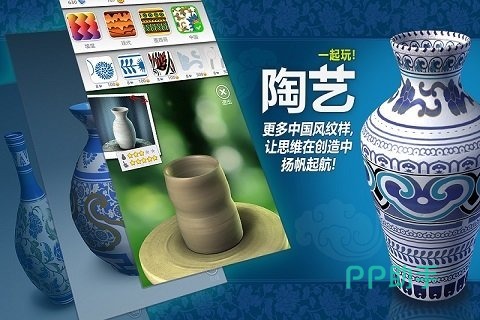《陶艺3D》用动态捕捉和物理渲染的技术,把陶艺创作在多维空间里最极致的张力展现出来。玩家在模拟旋转的转盘前,要对抗重力对高大器皿造成的坍塌危险,还要在毫厘之间准确控制修坯刀切割的深浅,来塑造出层次分明的浮雕纹理。内容中加入了一个非常成熟的材质编辑器,玩家可以对反射率、粗糙度和折射系数等进行逻辑上的调节,从而再现青花、影青和五彩瓷的真实质感。