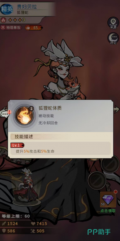 该角色拥有两个关键技能:主动技“致命香水”可对前方单体造成184%物理伤害,并附带60%概率施加灼烧状态;被动技“狐狸蛇体质”在登场时即提供5%攻击力与5%生命值增益。其中,“致命香水”的灼烧附加能力,在当前火系角色中具备唯一性,使其成为前期灼烧体系不可或缺的挂dot(持续伤害)人选。