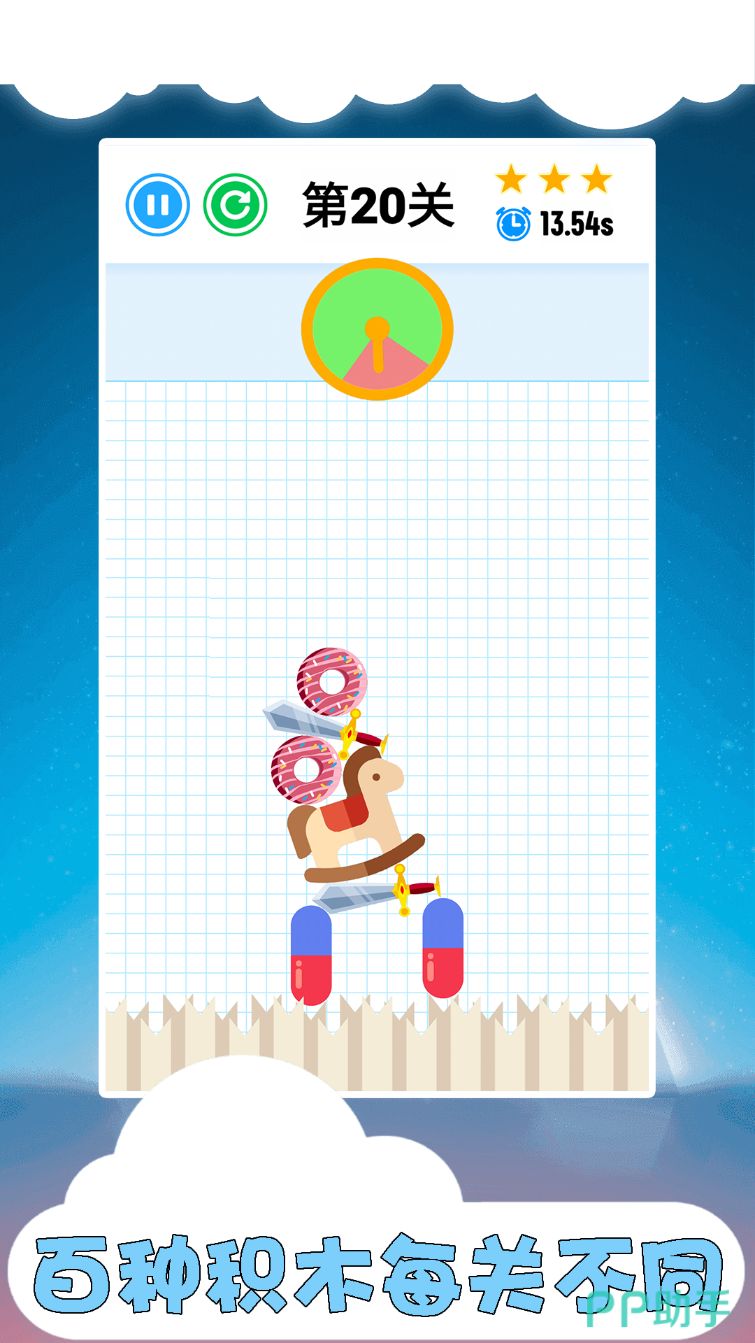 核心玩法聚焦于时间压力下的动态平衡构建。玩家拖动积木至目标区域释放,依靠自然下落完成堆叠,须在倒计时结束前确保全部构件稳定静止。关卡总数超过80关,从单点支撑起步,逐步加入斜面叠加、不对称负载、弹性反弹等变量,深度考验玩家对重心分布与力矩关系的理解与直觉反应。
