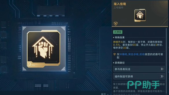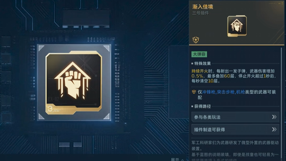 假如使用的是冲锋枪或者突击步枪,那最适合搭配的就是渐入佳境插件,在射击过程中会根据射击速度逐渐提升伤害,对于中短距离的武器适配性非常高,每次攻击后还会叠加一层效果,最多叠加到60层,通过渐入佳境插件能持续增强战斗力,作为基础插件,在前期获取也非常简单,通过在完成赛季任务就可以获得插件的奖励,后期任务的完成度越高,这些插件的品质越高,能给玩家带来更强的帮助。