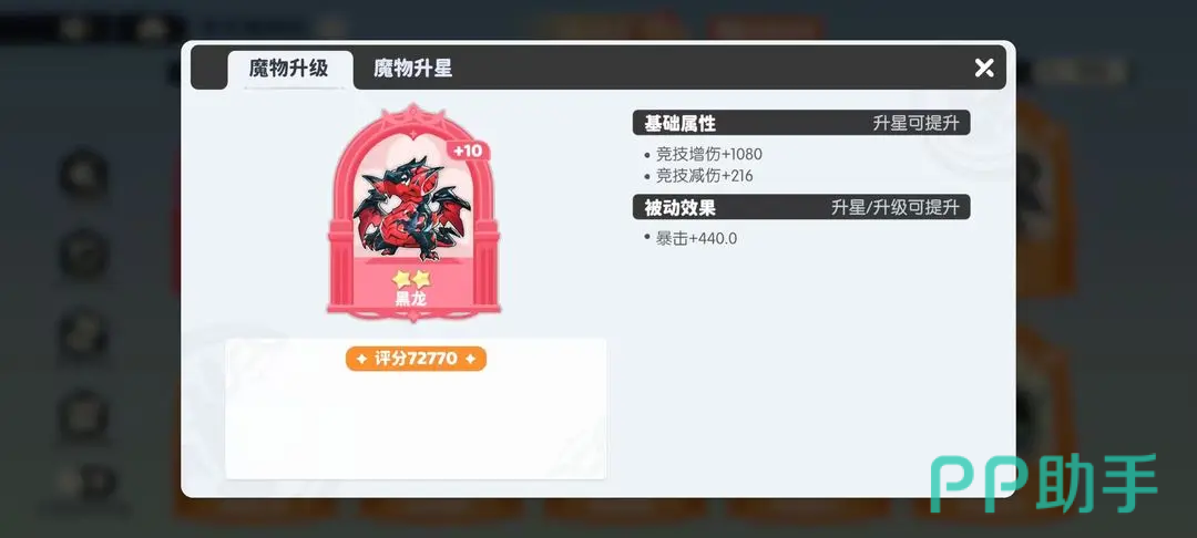1、等级提升。魔物等级直接影响被动效果数值,每升1级,被动增幅约提升10%。以黑龙为例:初始被动为+200暴击,升至10级后可达+400暴击。升级材料为曼德拉草,分初、中、高、特四级;除特级外,其余均可通过魔物炼制概率产出,亦支持合成获取。养成建议:优先将主力魔物(含黄金搭档)升至3级,再同步推进至6级、9级;10级因特级材料稀缺,可暂缓突破。