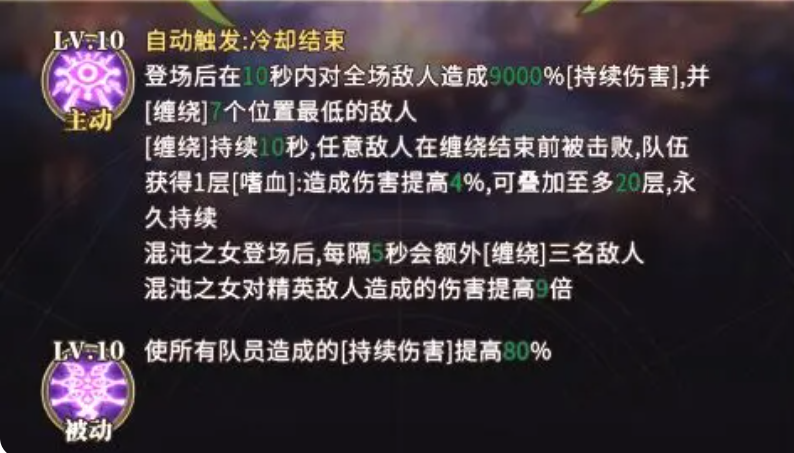 混沌之女的主动技能能够让混沌之女在把敌人给击退以后获得能够永久性提升伤害的嗜血效果,该技能为自动触发类型技能,当混沌之女登场以后会在10秒钟的时间内对场上的全部敌人造成9000%的持续伤害,并且还能够用缠绕能力将位置最低的7个敌人给缠绕起来,缠绕可以持续10秒的时间,只要有敌人在缠绕结束之前我方击败,那我方队伍就能够获得1层嗜血的能力,该能力可以使伤害提高4%,伤害提升效果可以叠加,最多能够叠加20层且永久有效,此外,混沌之女上场以后还会每隔5秒钟的敌人在额外的缠绕3名敌人,对于精英敌人所造成的伤害会直接提升9倍。