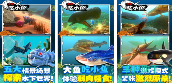 开局后只是一条小小的鱼,需要在充满危机的海洋世界当中努力存活,周围存在的危险比较多,但是要合理滑动或者是正确走位,将比自己小的鱼类全部吞噬,以此来壮大自己,亲自体验弱肉强食的自然法则,还有五大经典场景,可任由探索水下世界。