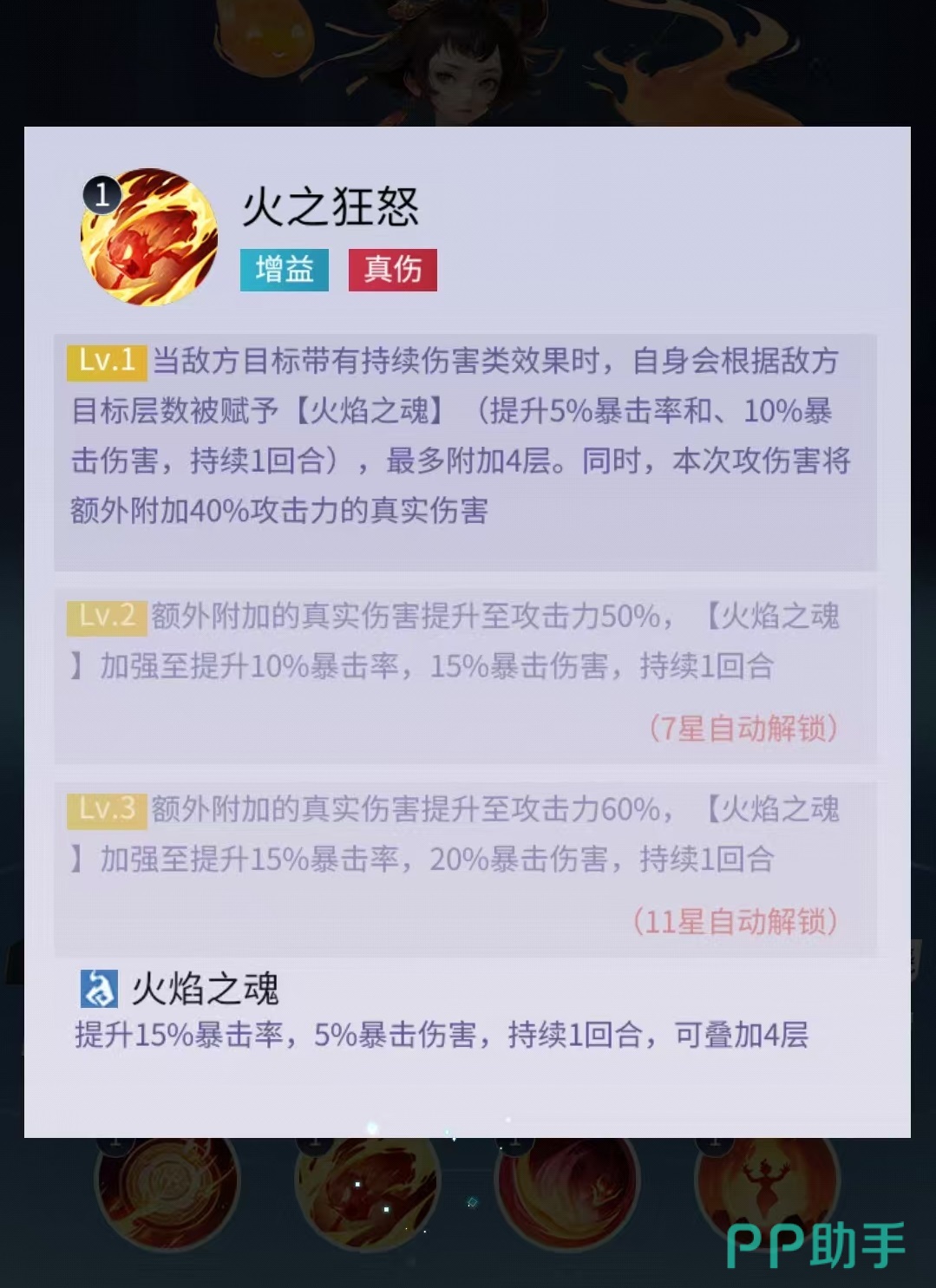 二技能具备协同增益机制:当敌方单位已存在任意持续伤害类负面状态(包括但不限于灼烧、流血、净火等)时,红孩儿本次攻击将根据状态层数叠加“火焰之魂”,每层提供5%暴击率与15%暴击伤害加成,最高可叠至4层;同时附加一次基于攻击力的真实伤害。该设计大幅强化了队伍中多角色异常状态的协同价值,使红孩儿在搭配具备DOT能力的队友时输出呈指数级增长。