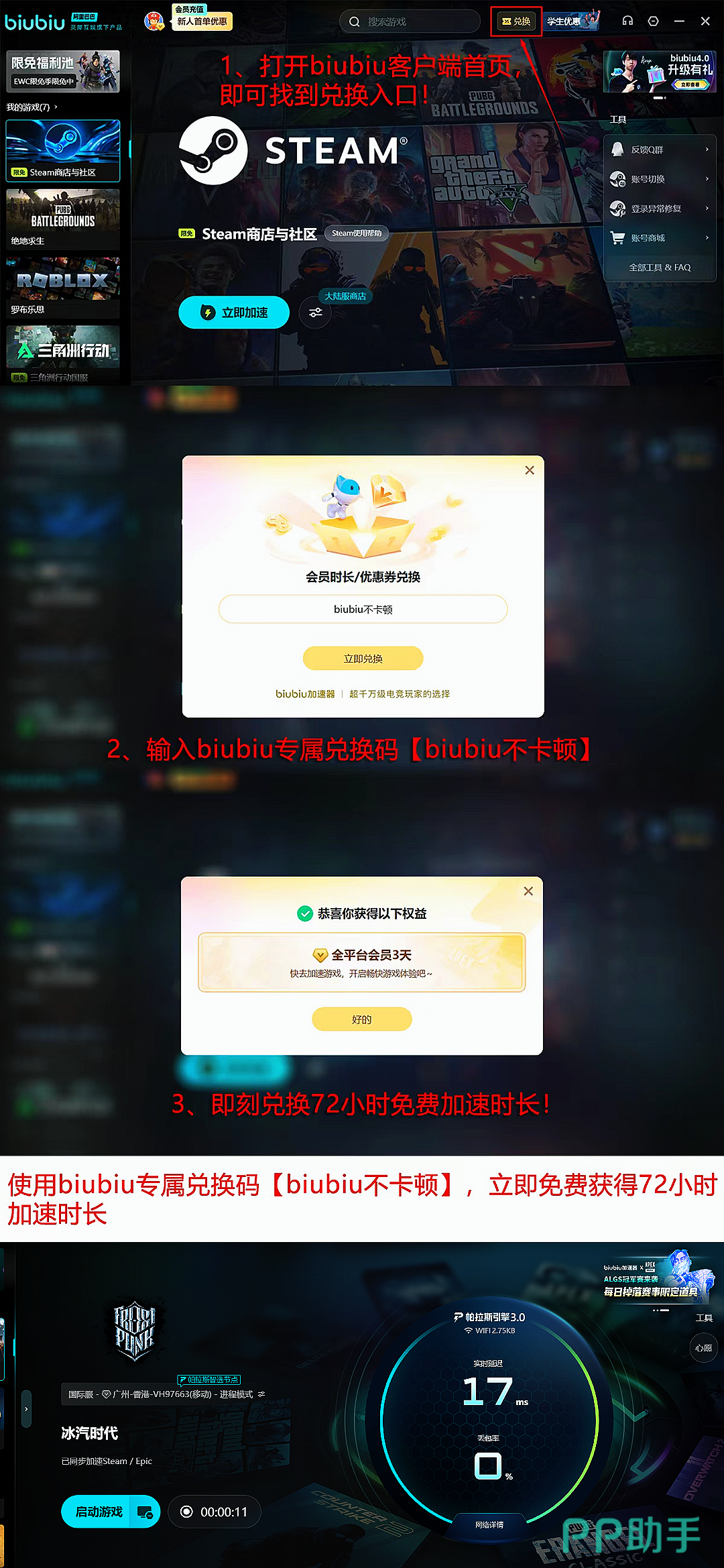 新用户完成注册后,可立即领取24小时全游戏免费加速权限;输入兑换码【biubiu 不卡顿】,额外获赠3天加速时长——总计96小时,覆盖《冰汽时代》单人战役、沙盒模式及全部多人服务器。该福利同样向老用户开放,无需绑定设备或订阅付费计划。