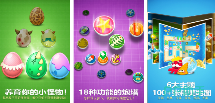 这是一款轻量级塔防游戏,核心目标为守护中央位置的萝卜不被怪物摧毁。共设40余种防御塔,涵盖减速、范围伤害、穿透攻击等差异化功能;怪物分波次进攻,每波数量、血量、移动速度及抗性属性均不同。关卡内置隐藏道具与成就系统,鼓励玩家尝试多种布阵方案以达成三星通关。