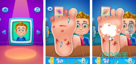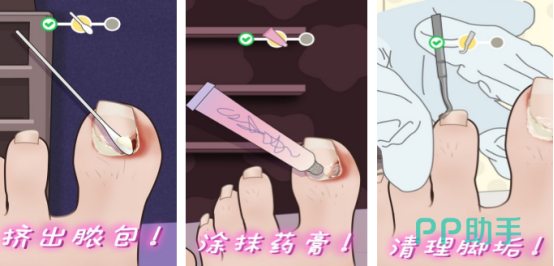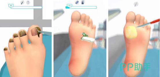 本作采用分关卡推进结构,每关脚部形态、病症组合均不重复。玩家扮演专业足科护理师,需依次完成清洁、去角质、修甲、消炎、包扎等完整流程。道具系统包含镊子、刮刀、消毒棉片、抗真菌药膏等真实器械,操作响应精准,触感反馈强烈,尤其在处理灰指甲剥离或甲沟清理环节,带来显著的物理解压效果。