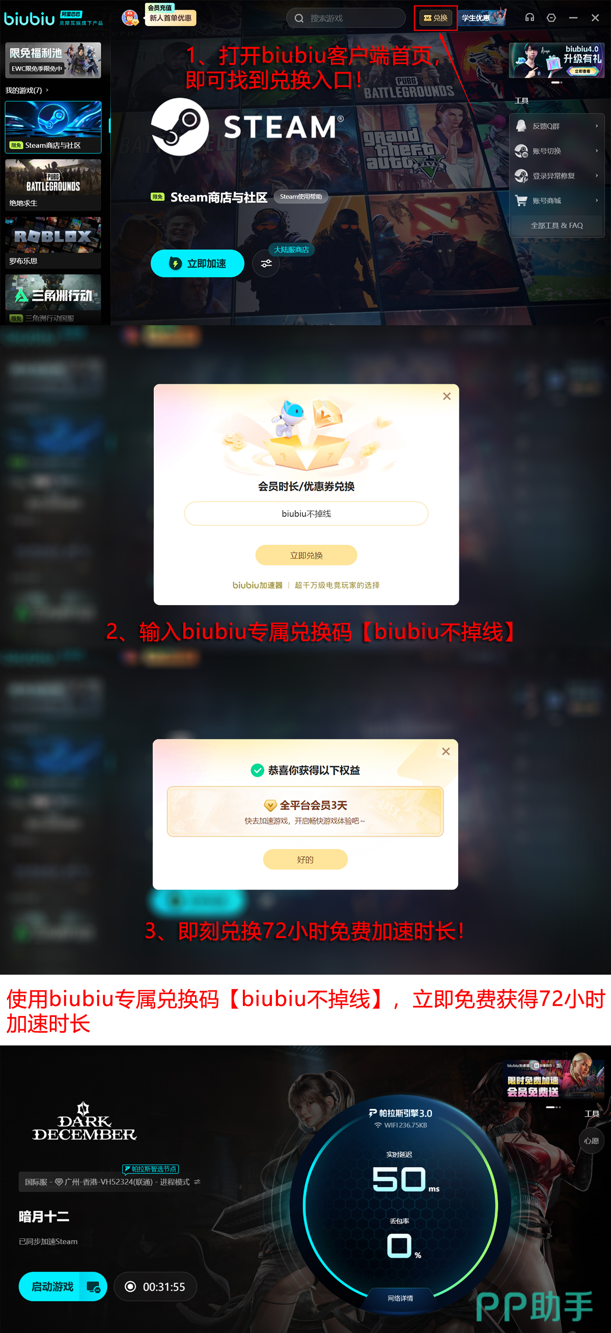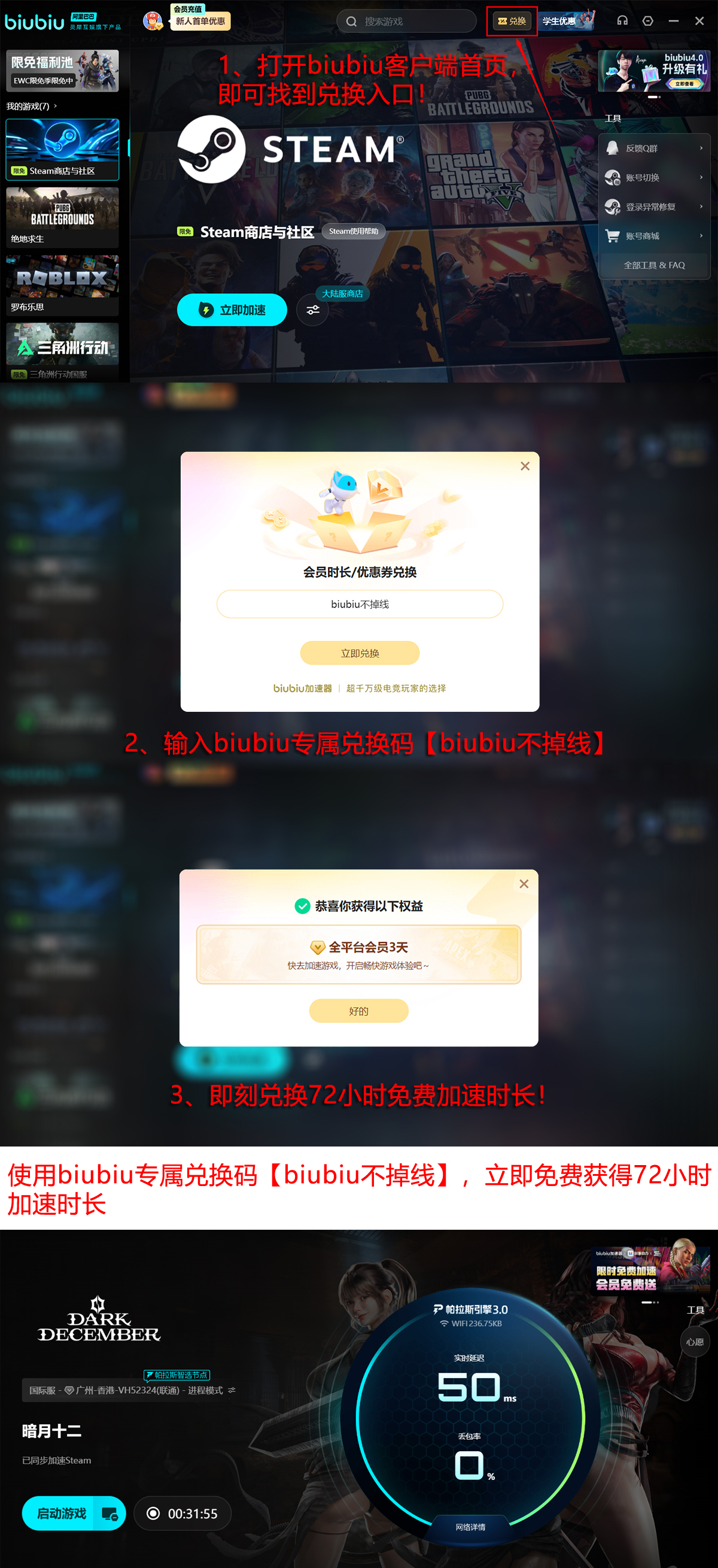 新用户注册即享多重时长福利:首次激活可获24小时免费使用权;再输入专属兑换码【biubiu不掉线】,额外领取72小时服务时长,累计达96小时连续可用,充分覆盖预载、测试及开服初期全流程需求。