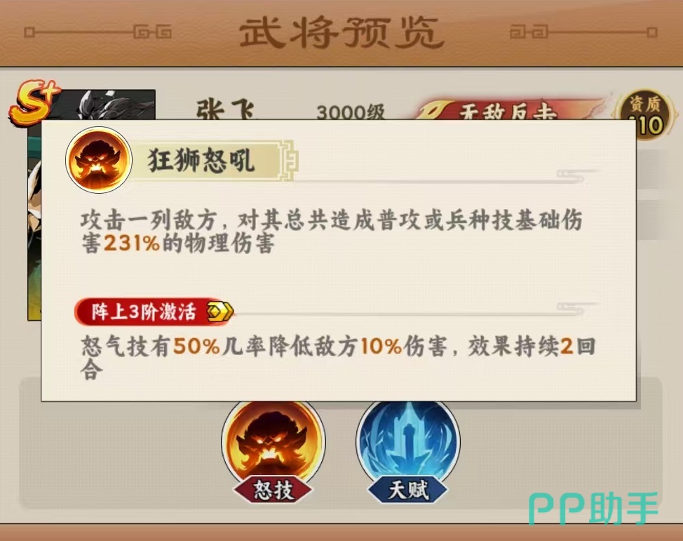 张飞的怒气技能具备双重战术价值:对正前方一列敌人造成等同于普攻或兵种技基础伤害231%的物理伤害;同时有概率使目标全体降低10%伤害,持续两回合。随着星级提升,其天赋逐层解锁——当友方单位遭受敌方主动攻击后,张飞有概率发动追击;可提升同排武将物理防御属性;并对近战与远程伤害产生反弹效果;当自身生命值首次跌破30%时,自动清除全部控制状态并获得一回合无敌效果。