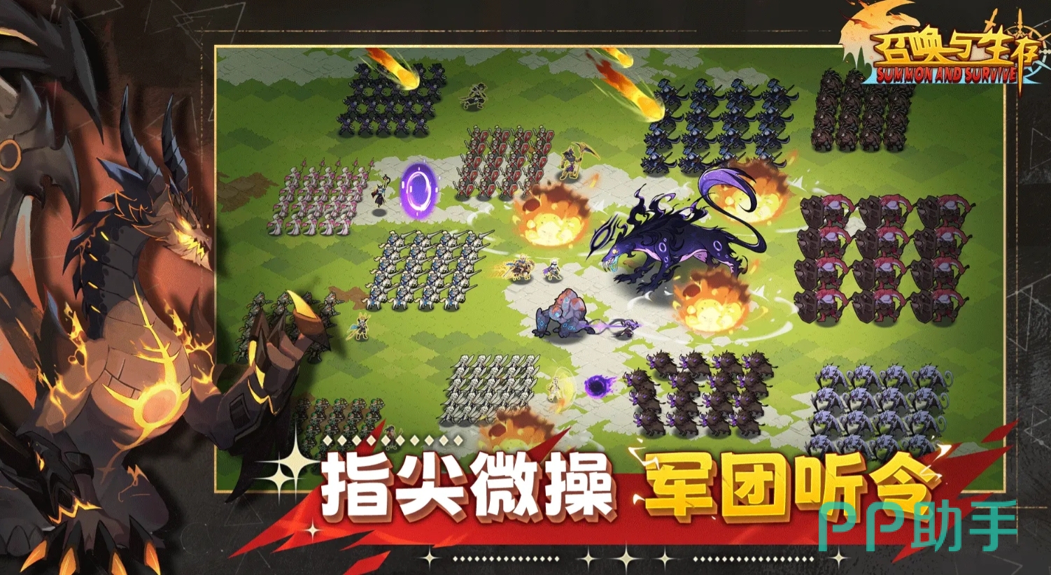 召唤兵团来与如同潮水般的对人作战,还能自由地进行兵种搭配,能让人们在《召唤与生存》中获得很不错的随机乐趣。玩家们可选定想要使用的英雄进入战局,并在击败敌人获取足够的经验后,在升级时选择随机刷出来的兵种来完成兵团的组建,每类兵种还能通过再次选择来升级,可让人们搭配出多种兵团阵容,只要讲关卡内所出现的敌人全部消灭,便能顺利过关。