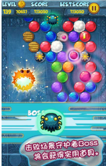 将三个颜色相同的泡泡消除之后就可以获得分数,每一次射击的泡泡颜色都是不同的,所以玩家要观察画面中泡泡颜色分布的位置,这样才能能够将相同的泡泡尽可能多的去消灭掉。随着关卡的不断晋升,游戏的难度也在提升,所以玩家要尽可能的去分析每一个泡泡所处的位置,在必要的时候可以利用一些道具来帮助自己通过关卡。