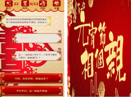 很多的单身人群面对长辈催婚时,显得特别的无可奈何,这种情况下,通过这一款在画面上融入了元宵节元素,可以模拟相亲的手游,大家可以提前的做好攻略。提供了20多个不同的亲戚,面对他们在催婚这方面所提出的各种问题,你也可以利用游戏的方式,学会如何应对的方式,这样就会因为自己的对话内容有不一样的结局。