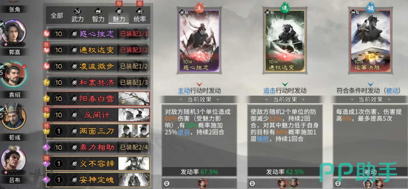 技能搭配方面,袁绍推荐携带【惑心挫志】【通权达变】【运筹决胜】。其中“运筹决胜”可显著提升其天赋触发频次,“惑心挫志”强化控制链(附带睡眠效果),“通权达变”则增强群体伤害与虚弱覆盖率。首次受击时还可获得额外兵力增长,契合其持久作战定位。