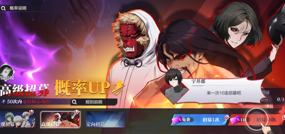 每位玩家每日享有1次免费招募机会。其余召唤行为需消耗“星辉券”或“共鸣积分”,二者均可通过商店兑换获得。其中,高级招募单次消耗100星辉券,而10连抽需消耗1000星辉券,该方式可确保至少获得1名SR及以上品质角色。此外,每日登录可领取限定UP池免费单抽,助力关键角色收集进度。