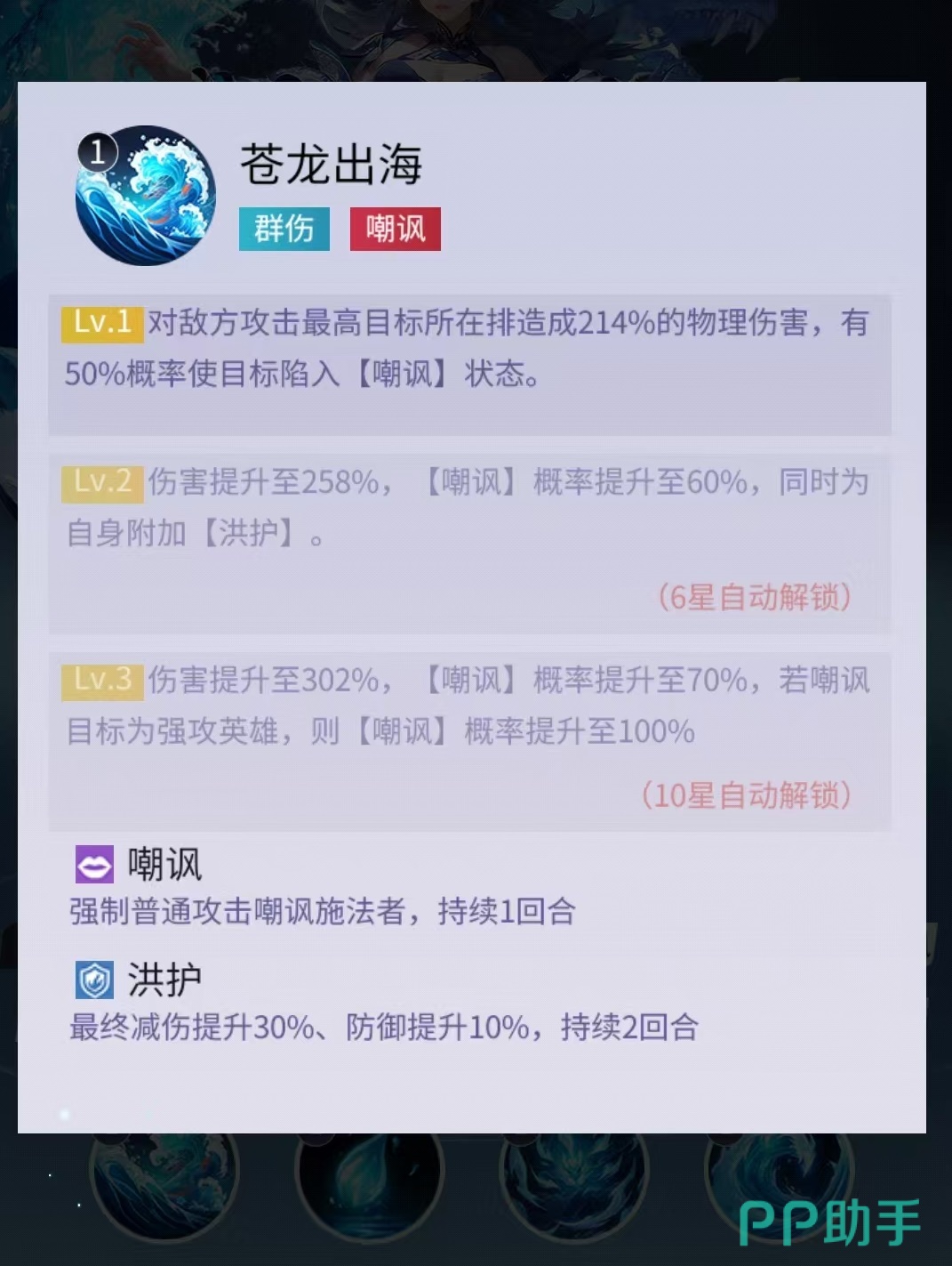 共工的核心怒气技能具备精准打击能力:锁定敌方攻击最高单位所在横排,发动范围物理伤害,并有概率触发“嘲讽”效果,强制该排敌人转向攻击自身;同时为其自身赋予“洪护”状态,提升最终减伤率与基础防御值。双重机制叠加,使其在承伤过程中仍能维持极高生存阈值。