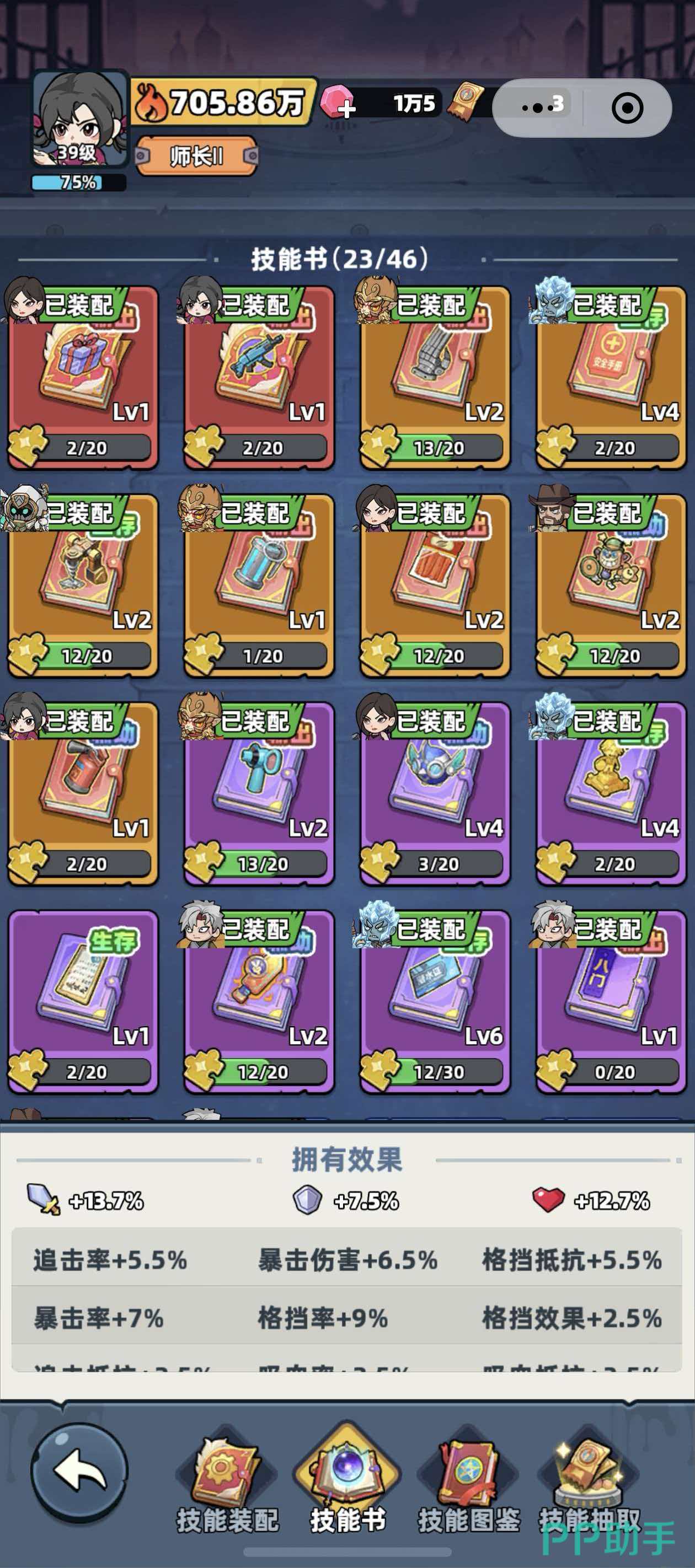 技能书系统是战力跃迁的重要支点。不同定位角色需匹配差异化增益:前排坦克首选《龟壳防御之艺术》,大幅提升生存阈值;辅助位推荐《肾上腺素学》,提供12%攻击速度加成,是赛博剑圣类角色的核心输出强化手段;若暂未获取该技能书,《八门尽开》为优质替代方案。此外,针对特定Boss机制,还可选用《烧成灰使者》《潜水学》《小象吹风书》等专项应对型技能书,实现精准破防。