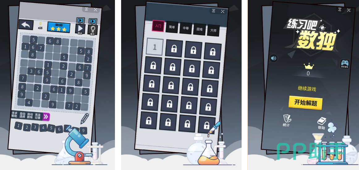 《练习吧数独》主要对经典的九宫格逻辑推理和大脑耐力进行训练。面对不同的盘面难度,玩家要根据已知的数字推出剩下的空格的唯一解。该作品既有从入门到大师的各个梯度,又设有人性化计时和错误提示。玩家在不断填写的过程中可以提高对数字的敏感度,进一步提升空间逻辑能力。玩家可以利用游戏中的笔记模式,把可能的数字记录在格角里,防止由于记忆偏差造成的连锁错误。