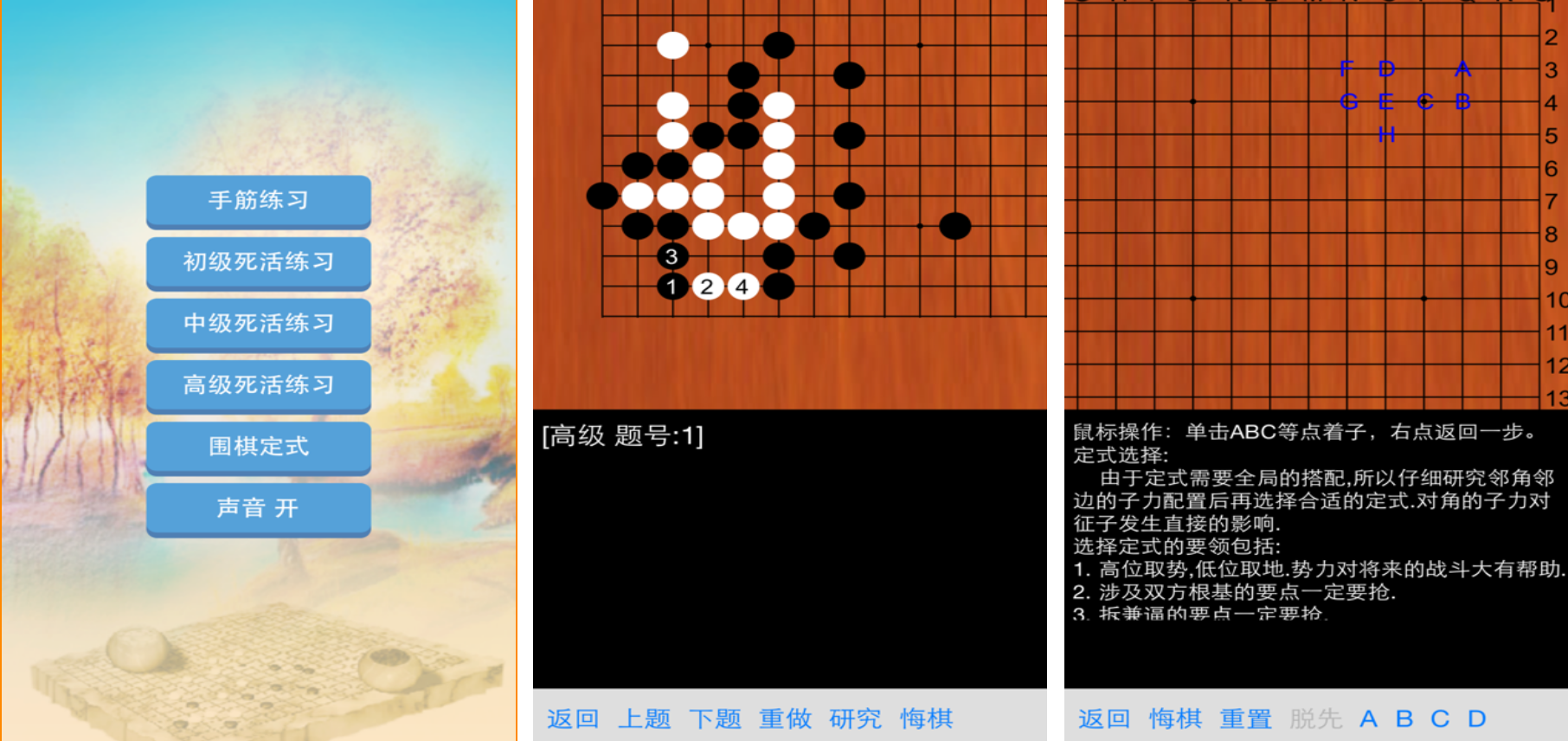 《围棋定式练习》对围棋布局阶段标准化的招法进行学习和深入的分析,围棋作为博大精深的智力运动,定式的掌握程度直接影响玩家在开局阶段的好坏。此作品包含了大量的传统定式与现代AI所推演出的新变化,玩家可以采用模拟对弈的方式在虚拟棋盘上反复练习挂角、托退等战术组合。玩家可以清楚地看到每一步棋背后的逻辑支撑,在实战中做到胸有成竹。游戏里还设置了专门用来解谜的困难阵法挑战,使玩家在复杂的盘缠之中找到最好的解决途径。