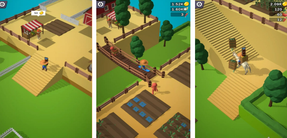 从一块荒地开始,玩家要慢慢把这里变成有模有样的农场。游戏里能种的东西很多,蔬菜水果都有,还能养鸡养牛,后面规模大了就是个农业帝国了。季节和天气会影响作物生长,不同农作物的收获时间也不一样,所以大家得想好怎么安排种植。玩家之间可以交易农产品,通过市场来赚钱,完成任务还能解锁新设施。
