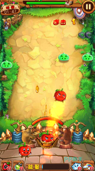 弹射玩法本身并不新鲜,但结合熊大熊二的故事背景后,整体风格变得更有辨识度。在关卡推进过程中,各种敌人会不断出现,玩家要做的就是通过发射弹珠来阻止它们前进。发射时需要留意敌人的外形,各种造型可爱的水果角色会从上方不断掉落,玩家需要在它们落地前全部清除,才能顺利进入下一关。