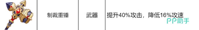 制裁重锤属于第二梯队的武器,它能提供40%的攻击加成,代价是降低16%的攻速。这个武器比较适合那些本身攻速就不快,但是单次伤害很高的幻灵。穿上去之后,虽然出手慢了一点,但每一下打出去的伤害会变得更高,总体输出其实没有降低太多。