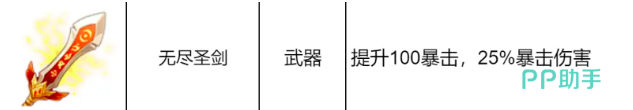 排在第一梯队的武器,小编首推无尽圣剑。这把武器穿上之后,能增加100点暴击和25%的暴击伤害,配合雅典娜使用的时候效果特别明显。因为雅典娜本身就是靠暴击打输出的幻灵,这把剑简直就是为她量身定做的。在后期的高难度副本里,有了这把剑,基本上输出能力会提升一大截。